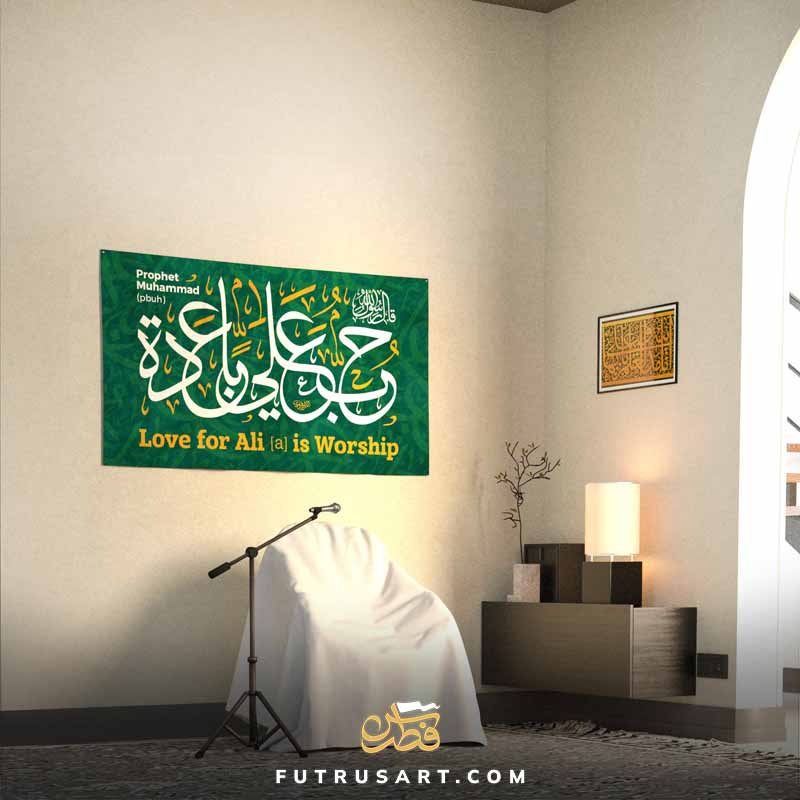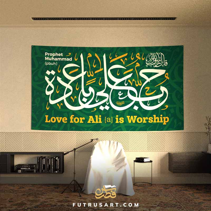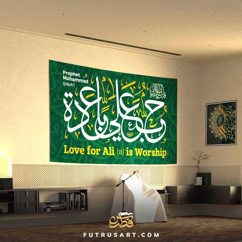Famous Hadith; Love of Ali (a) is Worship with beautiful Arabic calligraphy and English Translation